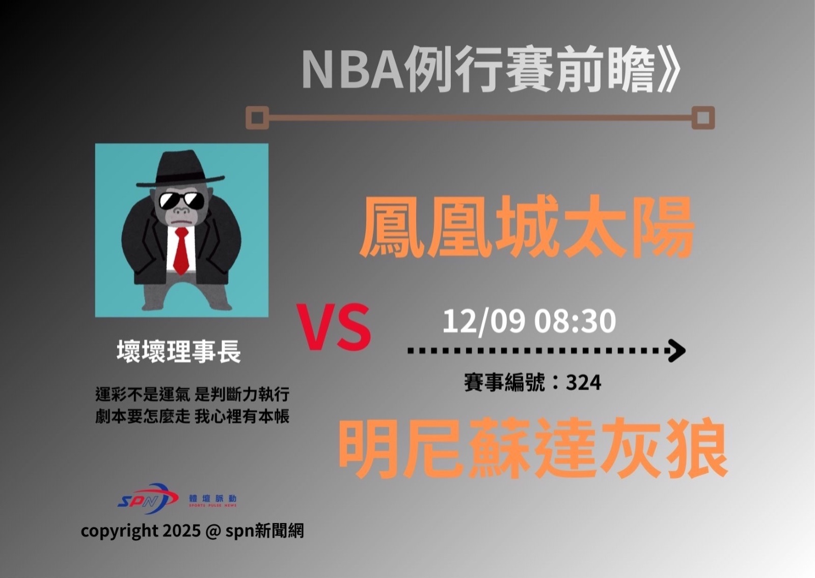 12 月 9 日 NBA 早場,鳳凰城太陽客場前往明尼蘇達灰狼。圖/spn新聞網製作
