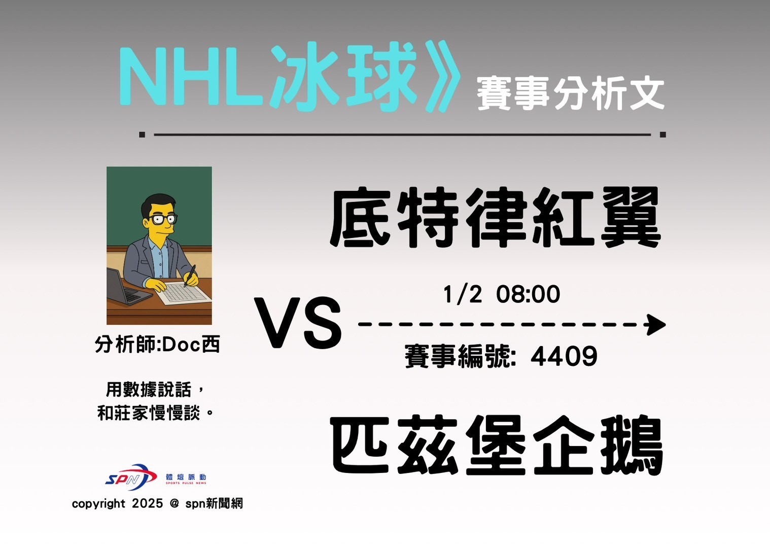 陣容配置:天壤之別的火力 這場比賽的勝負關鍵在於雙方名單上這兩個名字的狀態: 底特律紅翼 (DET) — 完全體降臨: 重大好消息: 前幾場缺陣的進攻大腦 Patrick Kane 已經出現在 Power Play #1 的名單中,且不在傷兵名單裡。這意味著紅翼的進攻將恢復完全體。 近況: 紅翼近 10 場 7 勝 3 敗 (80% Form),且處於連勝狀態。加上 Kane 回歸,火力將提升一個檔次。 門將: 老將 Cam Talbot 坐鎮,穩定性足夠。 匹茲堡企鵝 (PIT) — 殘陣掙扎: 核心傷兵: 二號中鋒 Evgeni Malkin (IR) 依然缺陣。正如我們之前分析的,沒了 Malkin,企鵝的進攻就像斷了一條腿。 門將隱憂: 預計先發是 Arturs Silovs。他通常是三號門將或替補中的替補,經驗與實力都不如對面的 Talbot。 近況: 近 10 場 3 勝 7 敗,狀態低迷。