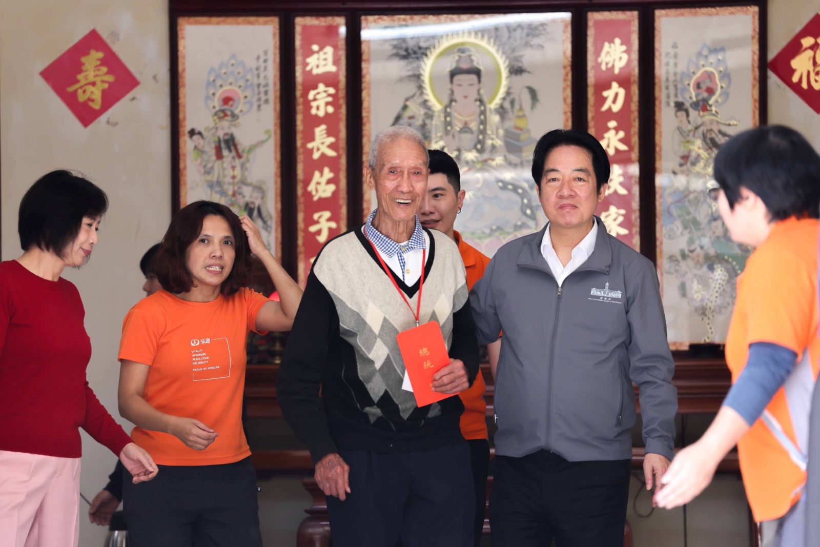 賴總統上午先前往台中松竹寺參拜,隨後在立委何欣純陪同下趕赴大坑與獨老圍爐。他也貼心為邱阿公、鍾波球爺爺與祖蔭奶奶夾年菜,致贈年禮與紅包,並帶著長輩們錄影向國人拜年,齊聲祝福「新年恭喜、闔家平安、馬到成功!」 邱阿公過去是老果農,因家庭變故失去果園,兒子與太太也相繼離世,所幸獲得新地主善心協助,無償借住果園旁平房,並仰賴社會補助維生。弘道基金會長期上山關懷,不僅提供生活物資,也定期陪伴聊天,協助邱阿公走過喪妻之痛。今年更為他舊屋翻新,進行大掃除,並修繕抽水馬桶、洗手台、燈管與老舊瓦斯爐台,讓邱阿公能安心在地生活。