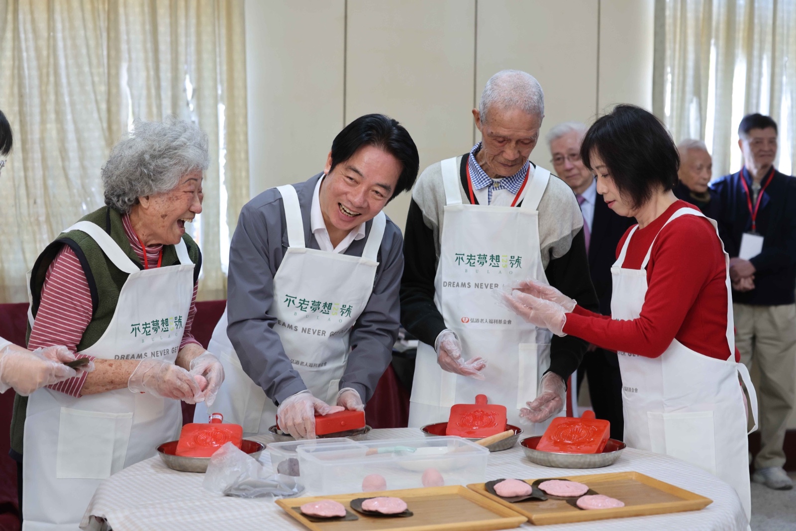 賴總統也與百歲鍾波球爺爺、83歲料理老師祖蔭奶奶一同圍爐,席間鍾爺爺即興表演魔術,送上祝福畫作,逗得現場笑聲不斷。祖蔭奶奶則親自指導賴總統做紅龜粿,賴總統穿上圍裙後略顯緊張,從壓粿、包餡到脫模都十分專注,還一度忘記在模具上抹油,忍不住向祖蔭奶奶請教「這怎麼辦?」,回憶也隨之湧現。 這是賴總統第5年參與弘道基金會「寒冬助老」活動,陪伴弱勢獨居長輩圍爐過年。