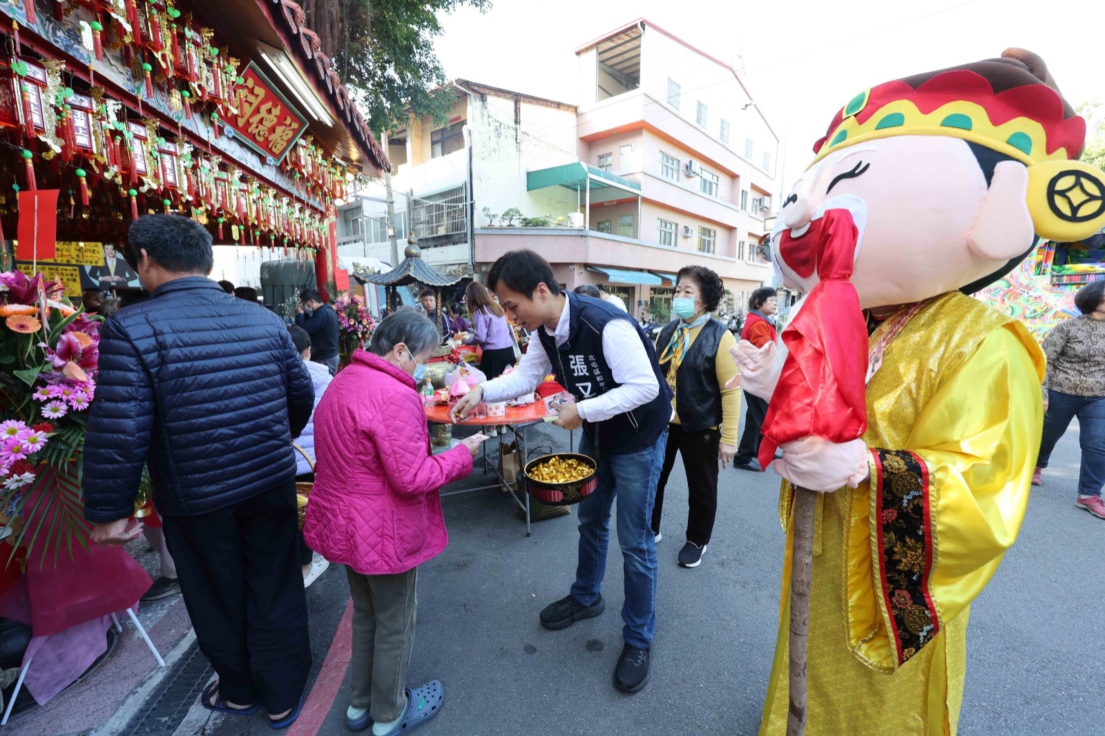 農曆二月初二土地公生前夕,北屯區和平里福德祠於今(3)日舉辦盛大的土地公尾牙活動。現場氣氛熱烈,湧入超過千人次居民共襄盛舉,人數再創近年新高。在濃郁的雞酒與麵線香氣中,除了虔誠的信仰傳承,里長參選人張又仁也以「暖男服務生」形象現身,成功在傳統民俗節慶中,為地方基層選舉注入一絲活力的氣息。 作為和平里年度重頭戲,福德祠今早便聚集了大批信眾。參選人張又仁別出心裁,安排了造型討喜的「土地公寶寶」人偶在廟口迎賓,不僅成為現場的「吸睛亮點」,更引發不少親子排隊合影。