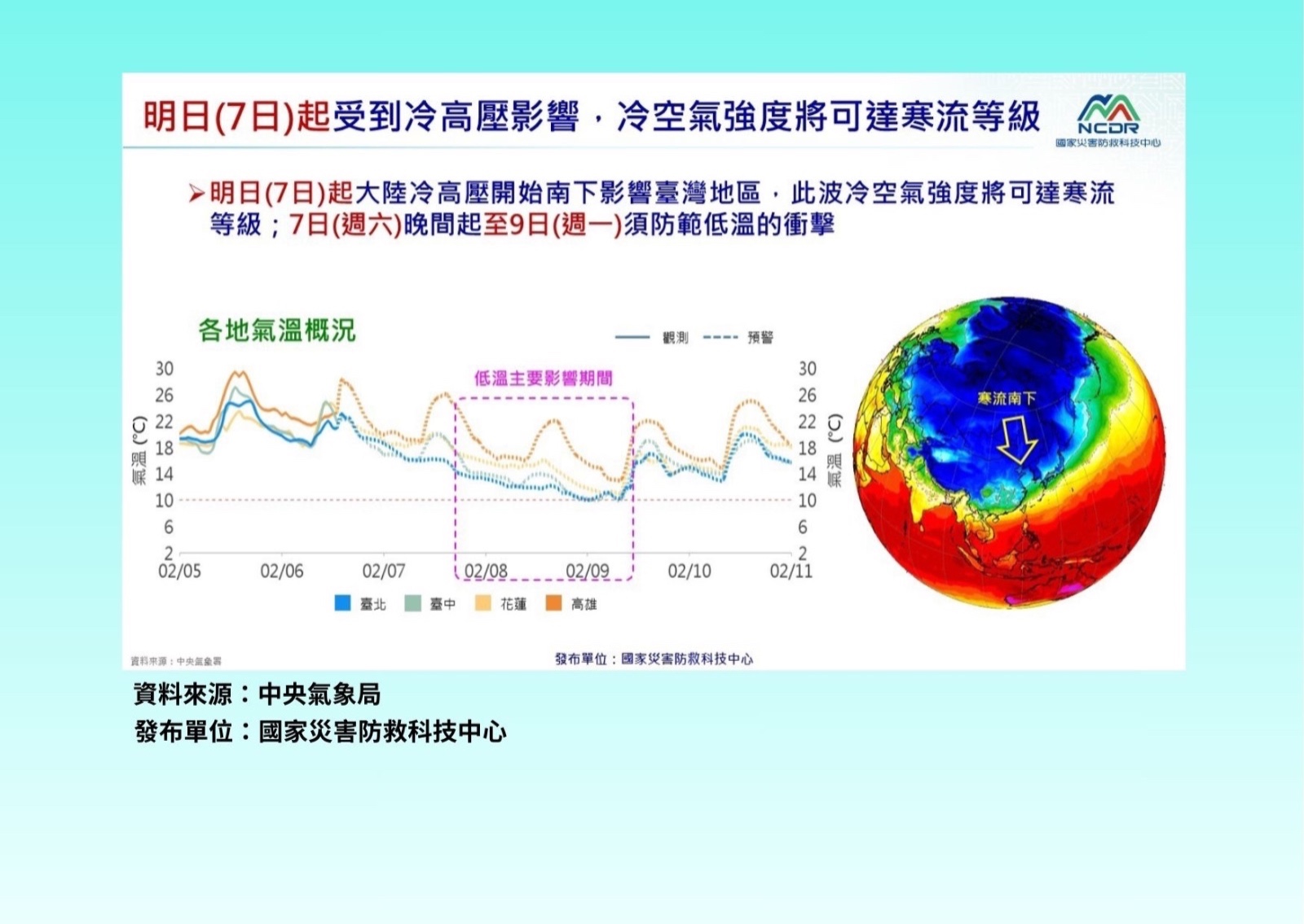 入冬以來最強冷空氣即將報到!根據國家災害防救科技中心(NCDR)最新圖資顯示,自明日(7日)起,受到大陸冷高壓南下影響,冷空氣強度將達到「寒流」等級。圖/SPN新聞網重製