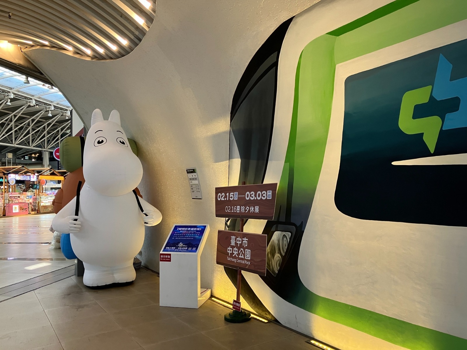 為了營造濃厚的童話氛圍,中捷公司將姆明一族的可愛身影融入捷運系統,不僅推出吸睛的「姆明一族彩繪列車」,更在捷運高鐵臺中站出口處設置大型「姆明氣球模型」,吸引大批粉絲駐足拍照。此外,活動期間旅客只要持電子票證搭乘捷運至文華高中站出站,即可領取限量姆明明信片,並能前往指定車站蒐集特色套色印章,將這段捷運旅程化為專屬的姆明回憶。