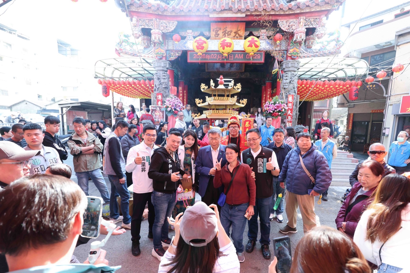 柯文哲一早到太平的太和宮發放小紅包與民同樂。圖/記者翁清雅攝影