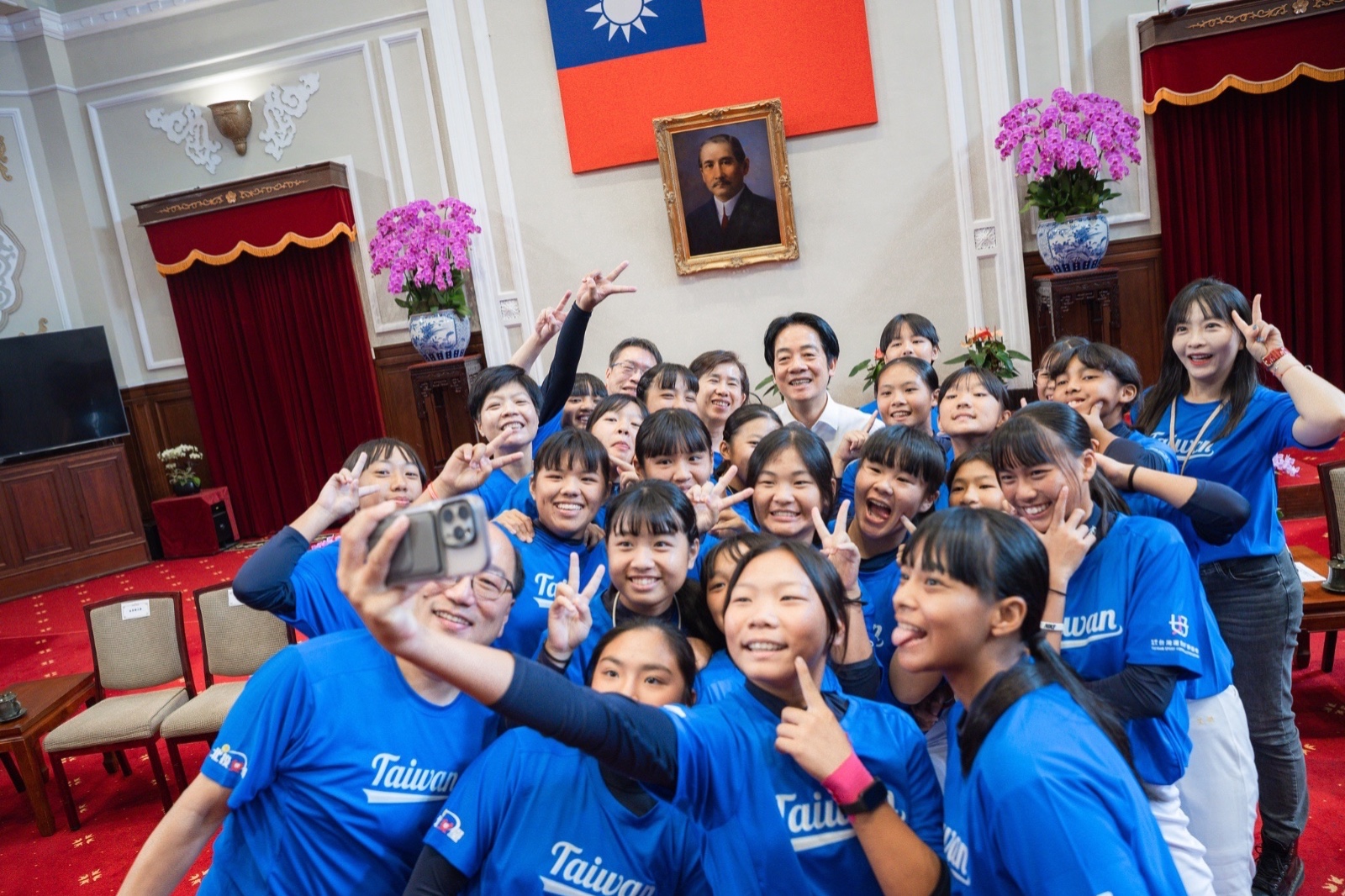賴清德總統今(16)日上午接見我國參加「2025貝比魯斯聯盟U16世界女子壘球賽」臺北市立北投國民中學代表隊。圖/總統府提供