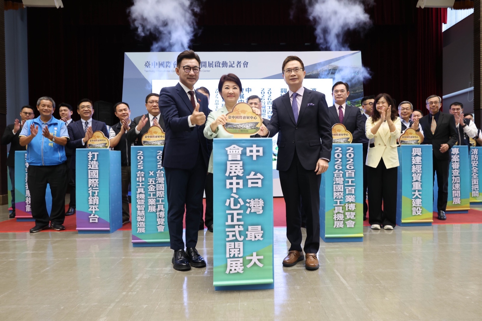 中部產業期盼20年的台中國際會展中心,今(7)日正式開展啟用。市長盧秀燕率市府團隊、外貿協會董事長黃志芳及多名產業領袖齊聚水湳經貿園區,共同宣布會展中心正式營運,迎來四大產業指標大展,為台灣經濟注入強心針。 台中市政府自籌89億元興建台中國際會展中心,歷經疫情、原物料上漲及缺工挑戰,終於於去年完工並交由外貿協會營運。