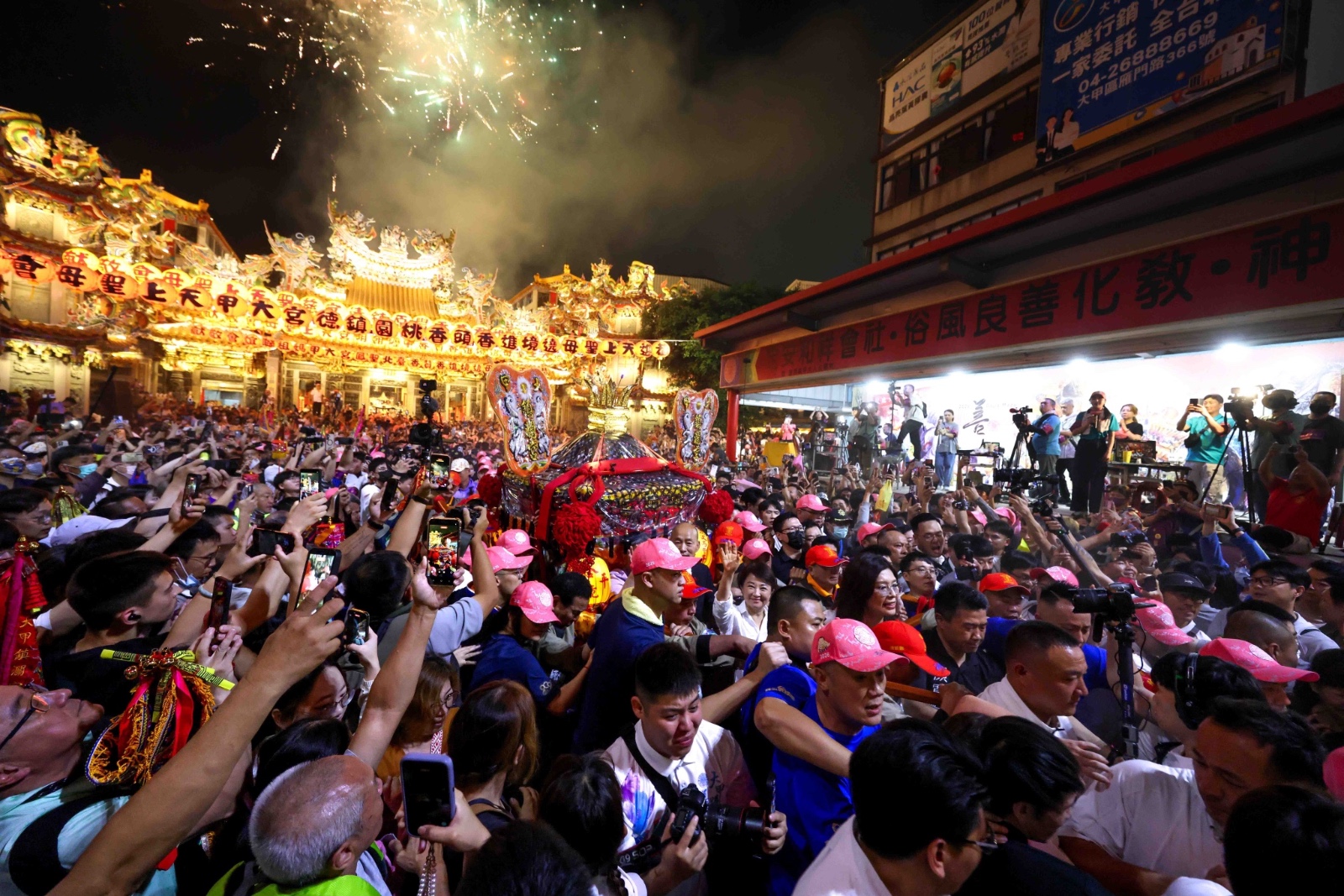 大甲鎮瀾宮今晚10時5分,在立法院長韓國瑜、台中市長盧秀燕、國民黨主席鄭麗文、等人,共同扶轎下正式起駕。圖/記者翁清雅攝影