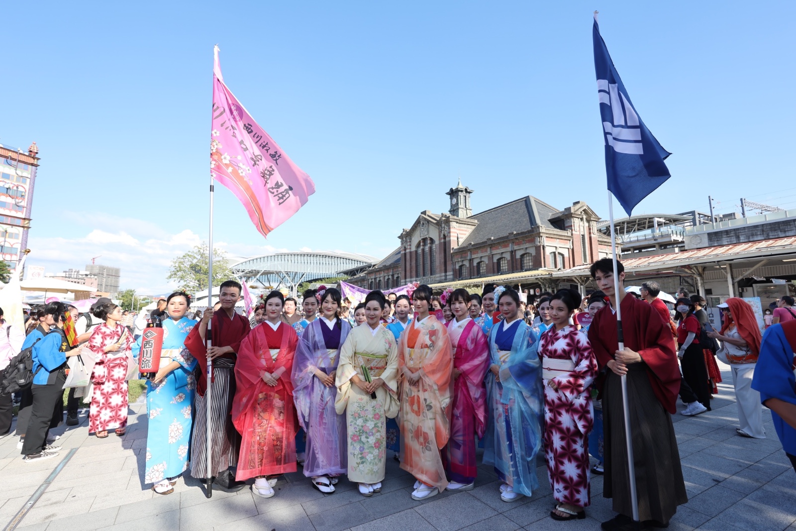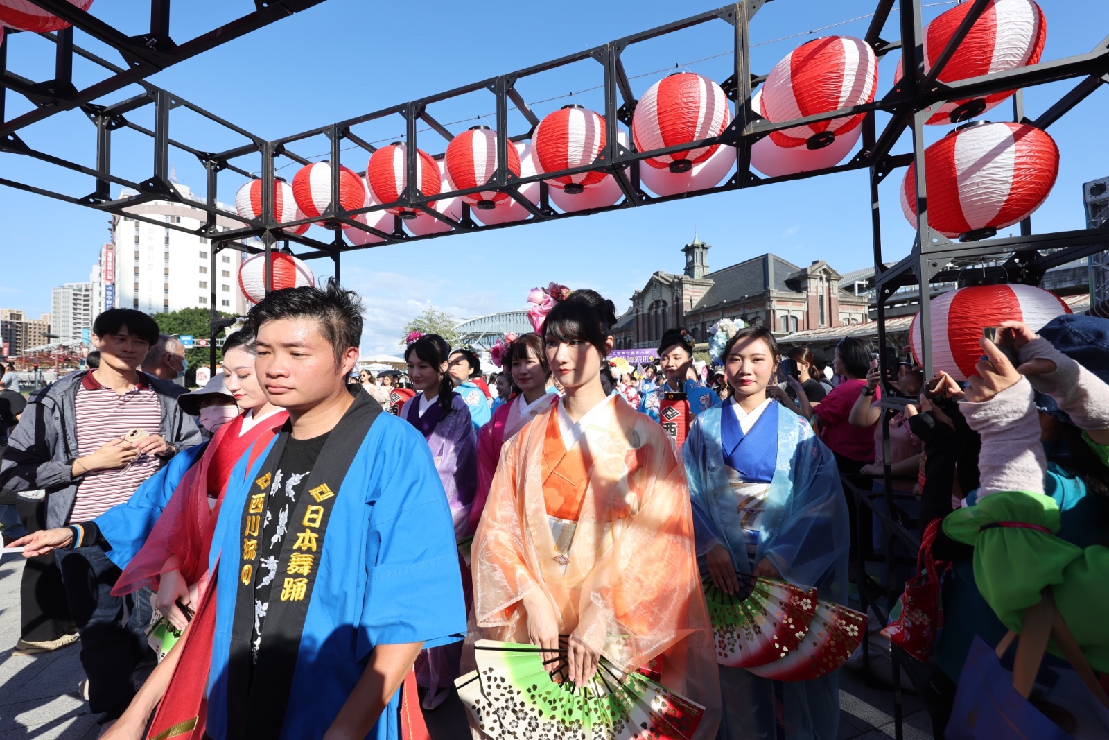 台中中區舊火車站前今(25)日洋溢濃濃日式氛圍,「蘭鈴通散步納涼會」熱鬧登場!活動從台中火車站一路延伸至中山路沿線,沿途掛上燈籠與日式旗幟,伴隨著悠揚的日本歌舞音樂,彷彿讓人穿越時空回到昭和年代。 今年的納涼會以「夏夜散步‧舊城重現」為主題,邀請民眾穿上和服、浴衣漫步街頭。