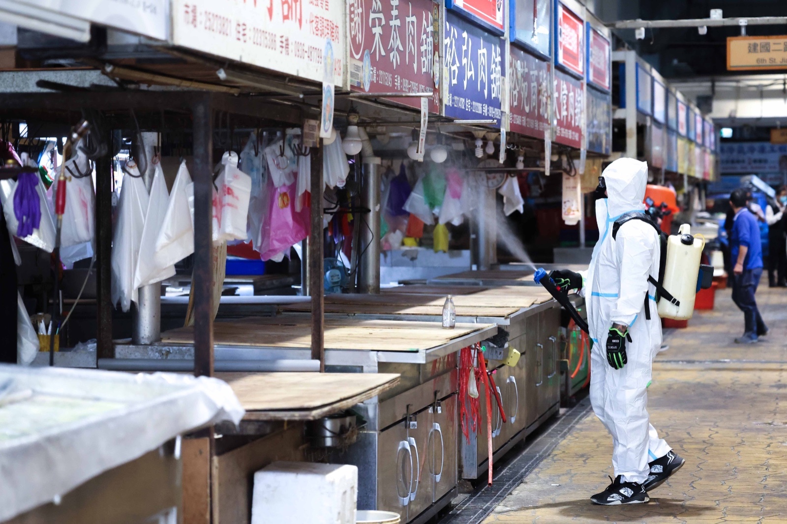 因應台中爆發非洲豬瘟疫情,台中市政府今(5)日下午派員前往建國市場展開全面清消。記者翁清雅攝影