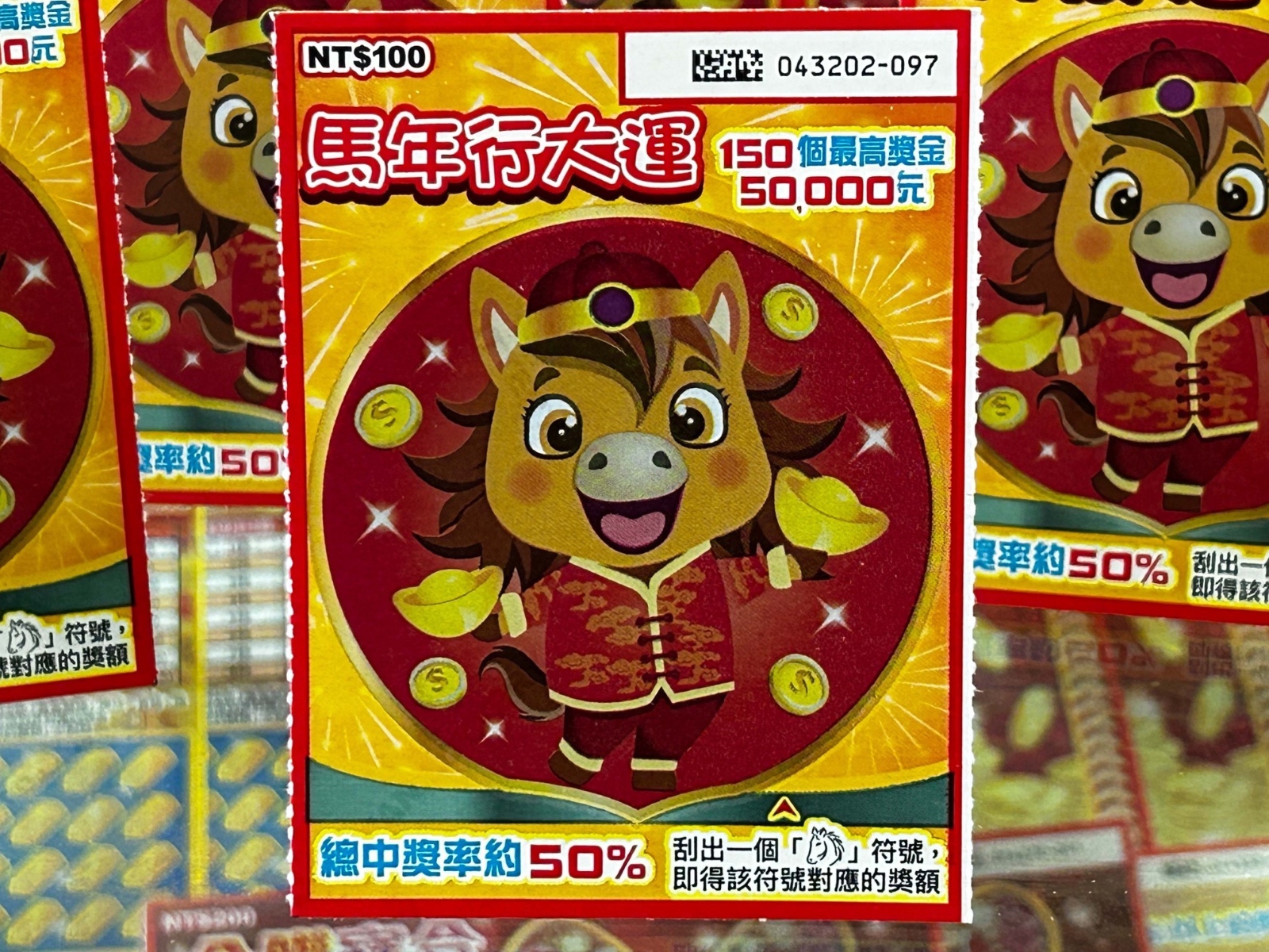 馬年行大運(100元): 針對生肖年特別設計的Q版主題,強調高頻率中獎體驗,總中獎率達50.1%,平均每兩張就有一張中獎,最高獎金5萬元共150個。