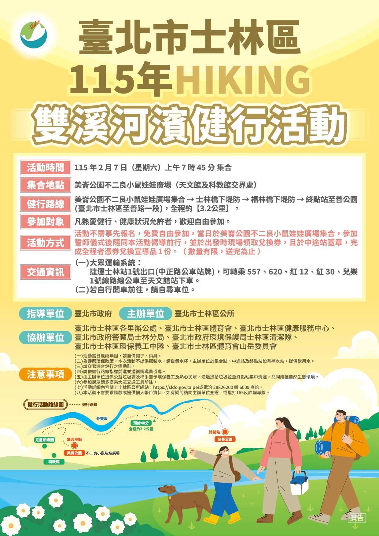 台北市士林區即將迎來充滿活力的週末早晨!士林區公所將於 115 年 2 月 7 日舉辦「雙溪河濱健行活動」,誠摯邀請市民朋友在立春之際踏出戶外,體驗自然生態與運動休閒的完美結合。本次活動不僅強調身心健康,更跨國界融入了新住民的多元文化,為傳統的健走注入全新生命力。