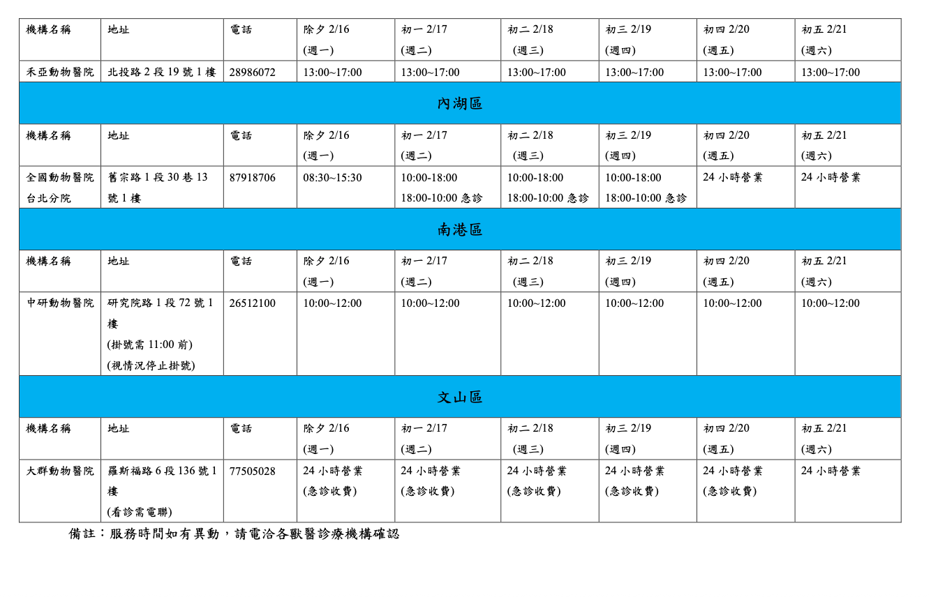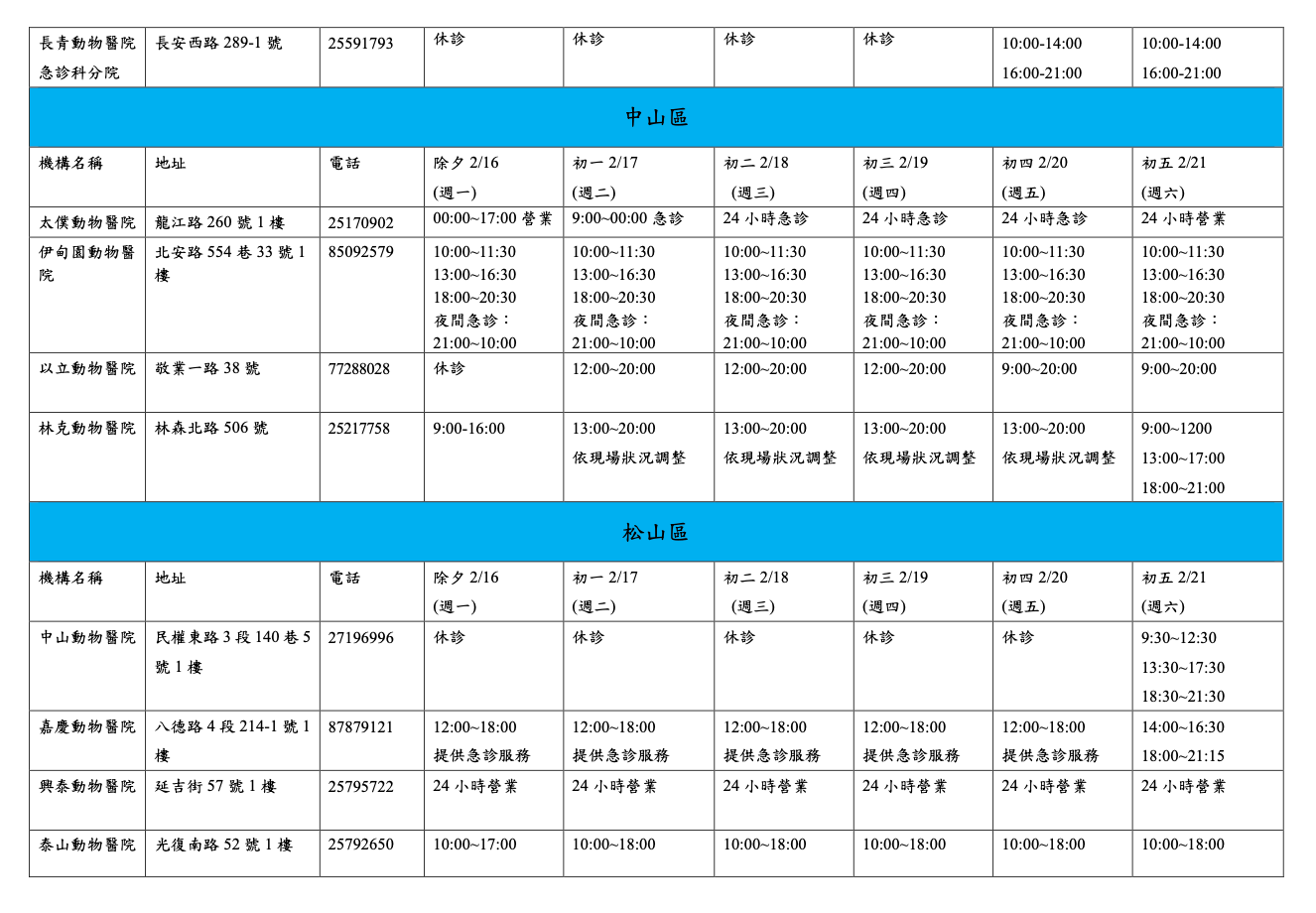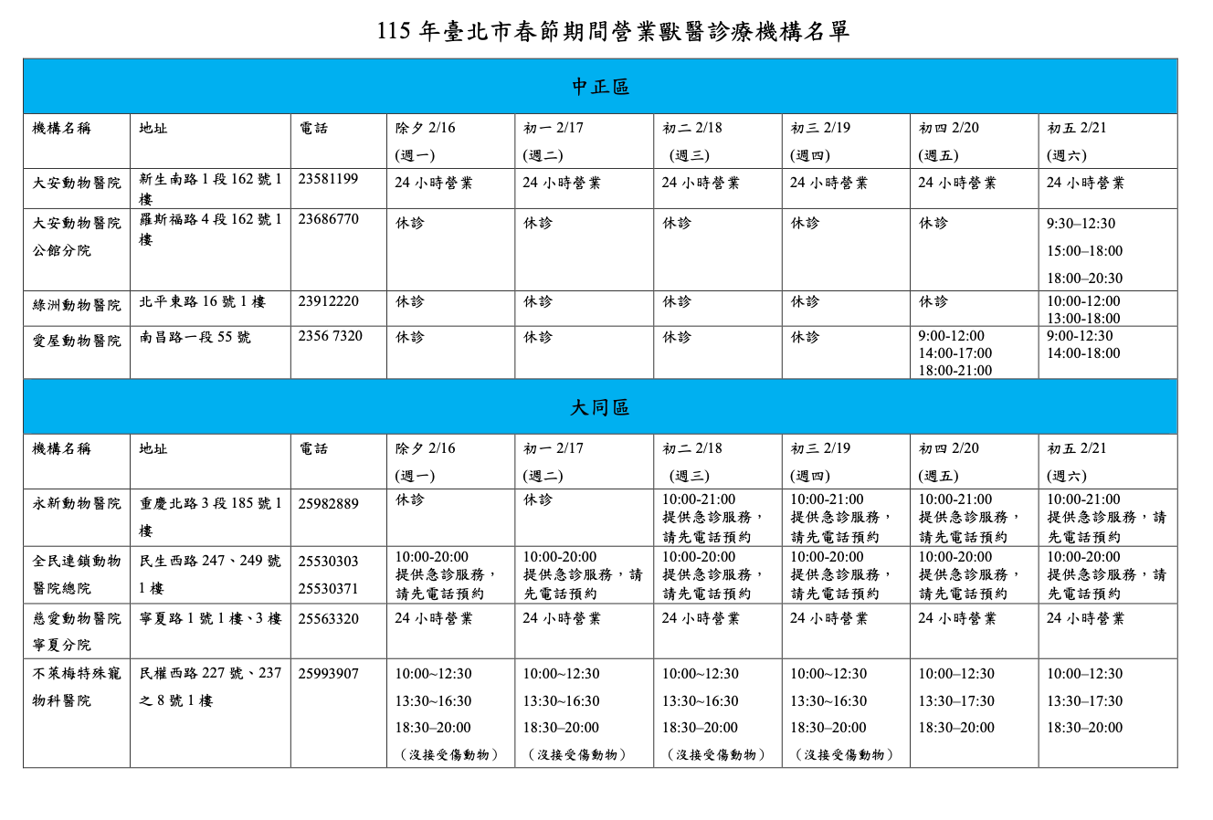 隨著春節連假將至,許多飼主正忙著採買年貨、規劃出遊,然而家中有毛小孩的人最擔心的,莫過於在診所普遍休診的連假期間,寵物若突然出現身體不適該如何尋求協助。為了讓飼主能安心過節,台北市動物保護處特別於年前超前部署,針對全市272間動物醫院進行調查,協助毛家長守護寵物健康。