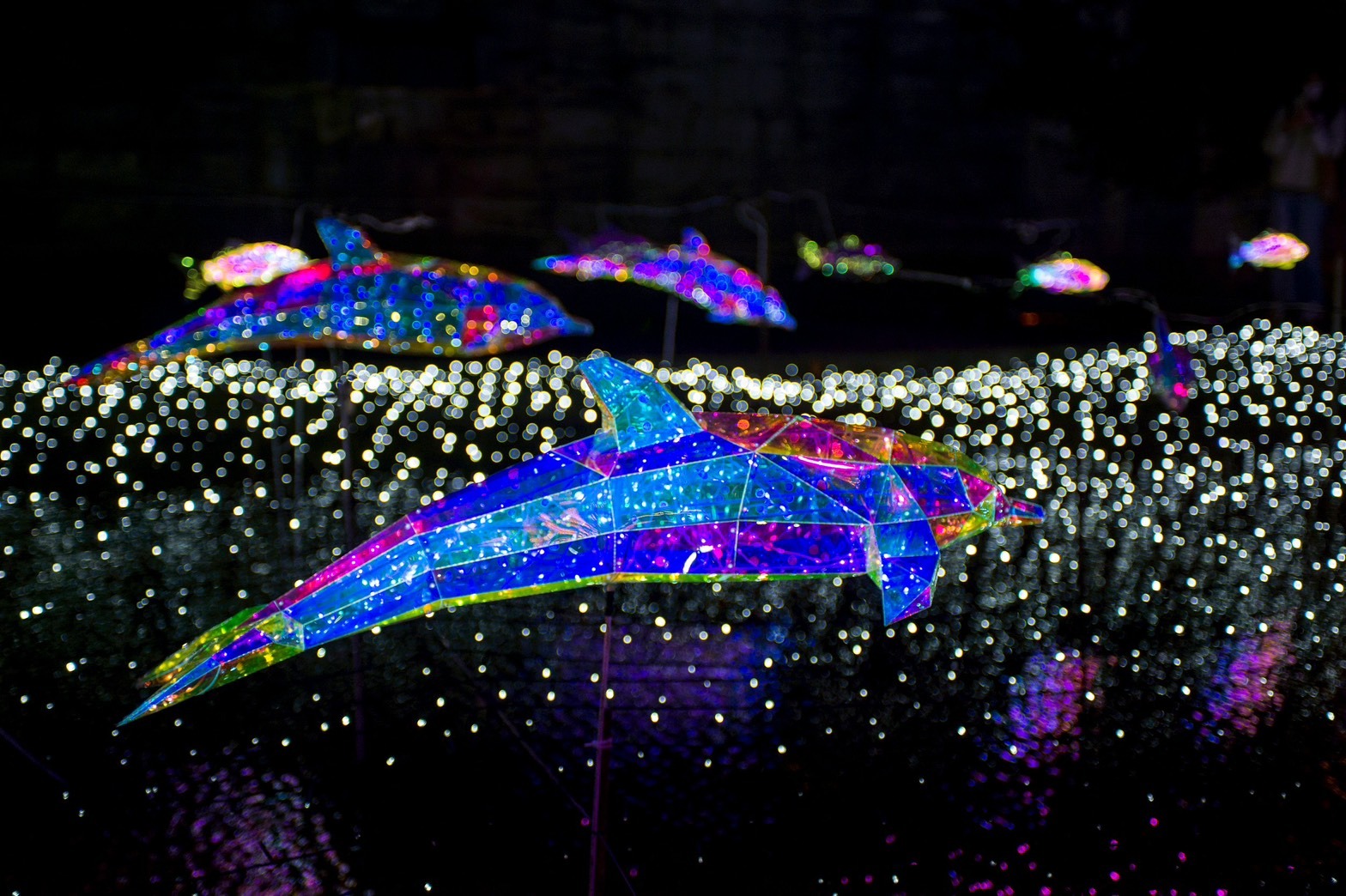 光影海豚悠游夜色燈海映照浪漫水岸。圖/新北市政府