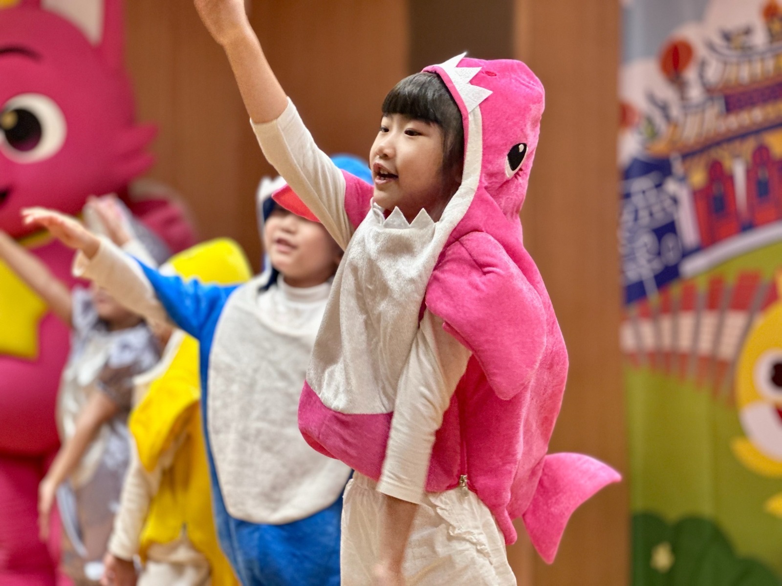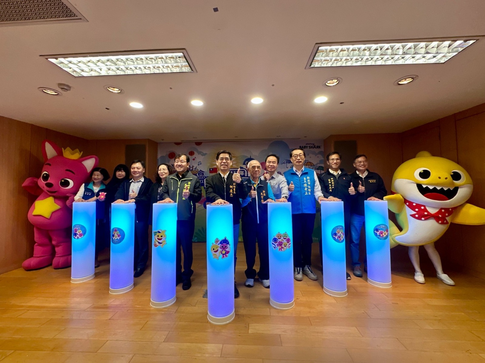 記者會現場開場表演邀請超人氣卡通明星碰碰狐及鯊魚寶寶以歌舞帶動,營造歡樂氣氛。圖/新北民政局