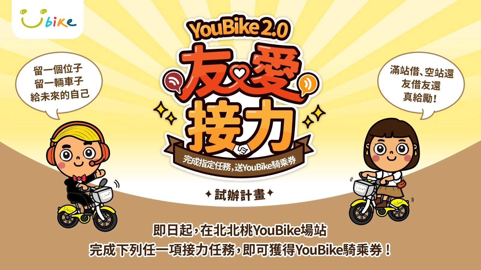 「YouBike 2.0友愛接力」計畫無需額外登錄,所有YouBike會員都具有參加資格。只要會員從無位(滿站,App圖示為紅色)場站借出YouBike 2.0自行車,或將2.0自行車歸還至無車(空站,App圖示為橘色)場站,即可獲得每次5元的騎乘券獎勵。即使是從滿站的無位場站借出2.0E電輔車,因為也算為下一位使用者留了一個空位,同樣提供5元電子騎乘券。