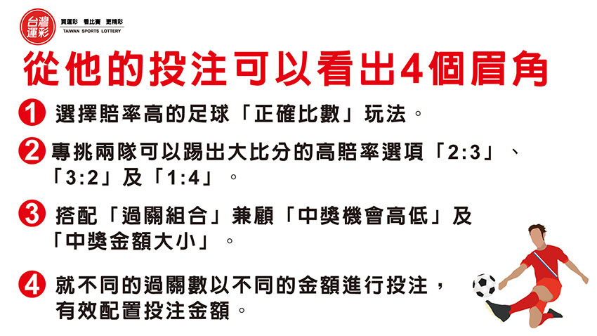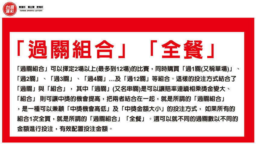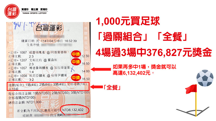 運彩「過關組合」是很多購券者喜愛的投注方式,特別適用在高賠率的玩法上,因為只要有過1關,通常就可以小賺,過2關以上賠率得以連續相乘就會大賺,還可以依資金的預算,就不同的過關數以不同的金額進行投注,今天就以1位購券者以1,000元買足球「過關組合」4場過3場中376,827元獎金的實例,來跟大家分享他是怎麼買的。