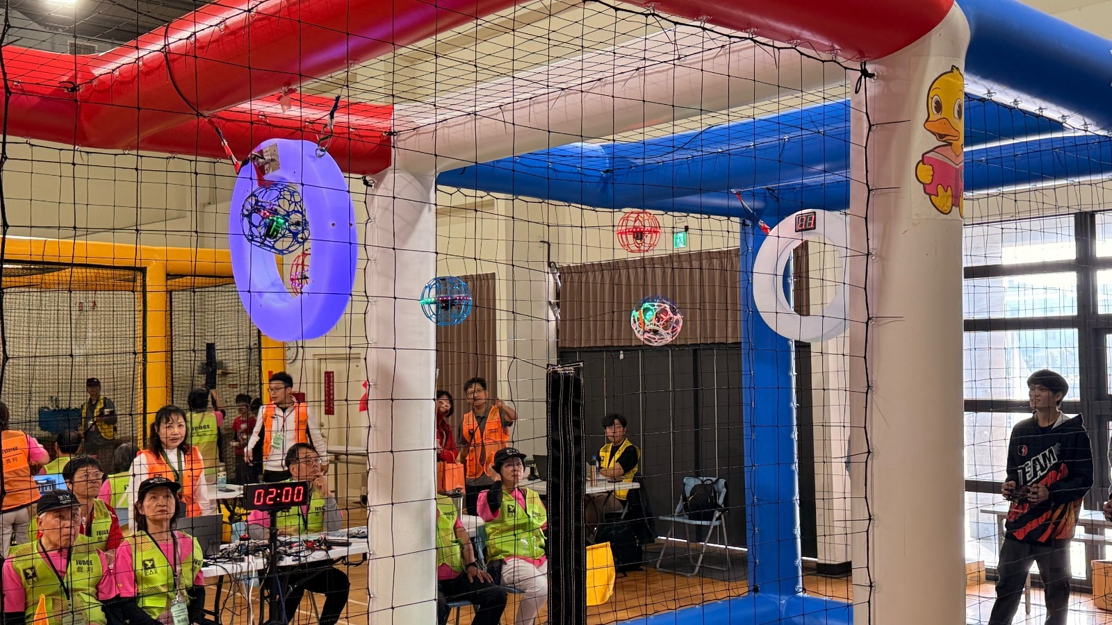 無人機足球(Drone Soccer)是近年在國際間迅速崛起的新興科技運動。參賽選手須操控具有網狀保護外殼的球型無人機,在特定的室內場地中進行激烈的攻防對戰,目標是將「球」送入對方的空中球門得分。這項運動不僅考驗選手精準的操控技巧,更高度重視團隊間的戰術運用、攻守轉換的默契,以及基礎的電子工程維護能力。比賽現場球影穿梭、碰撞聲與驚呼聲此起彼落,緊湊的節奏讓現場觀眾與家長目不轉睛,驚嘆科技運動帶來的感官震撼。