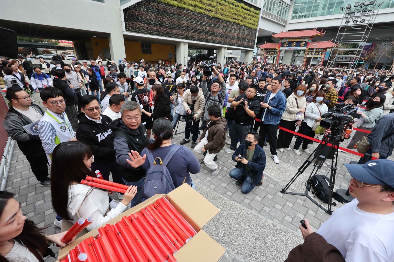 中華職棒會長暨立委蔡其昌今(17)日正式推出 2026 限定版「Team Taiwan 尚勇」春聯,水安宮發放點吸引破萬人潮塞爆現場。圖/記者翁清雅攝影