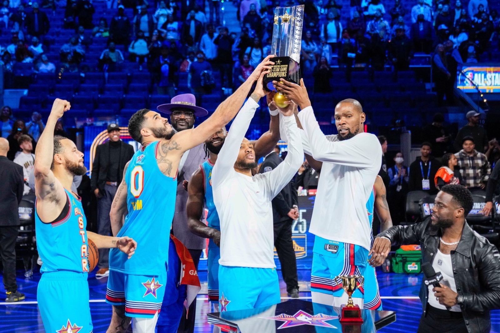 圖為2025年 NBA 全明星賽於大通中心奪冠隊伍,陣中球員金州勇士隊後衛史蒂芬·柯瑞(Stephen Curry,30號)、波士頓塞爾提克隊前鋒傑森·塔圖姆(Jayson Tatum,0號)、密爾瓦基公鹿隊後衛達米安·里拉德(Damian Lillard,0號)以及鳳凰城太陽隊前鋒凱文·杜蘭特(Kevin Durant,35號)一同捧盃慶祝。圖/路透社/達志影像