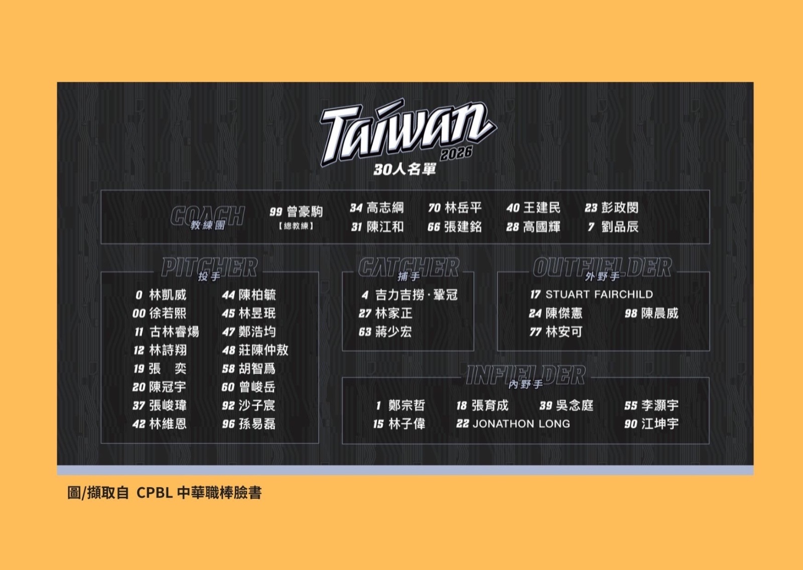 2026WBC中華隊30人完整名單: 投手16人 林昱珉、莊陳仲敖、沙子宸 陳柏毓、林維恩、徐若熙古林睿煬、孫易磊、張峻瑋胡智爲、張奕、鄭浩均曾峻岳、林凱威、陳冠宇林詩翔 野手14人 林家正、吉力吉撈.鞏冠蔣少宏、張育成、吳念庭鄭宗哲、李灝宇、林子偉江坤宇、林安可、陳晨威陳傑憲龍恩(Jonathan Long) 費爾柴德(Stuart Fairchild)