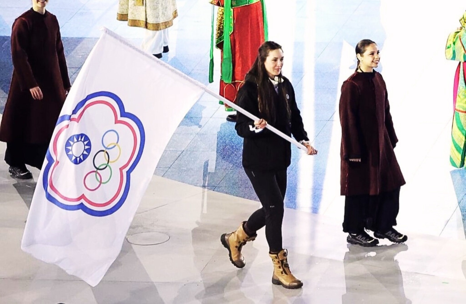 台美混血越野滑雪選手余睿(掌旗者)擔任台灣代表團的掌旗官,她受訪時表示非常榮幸。圖/中華奧會提供