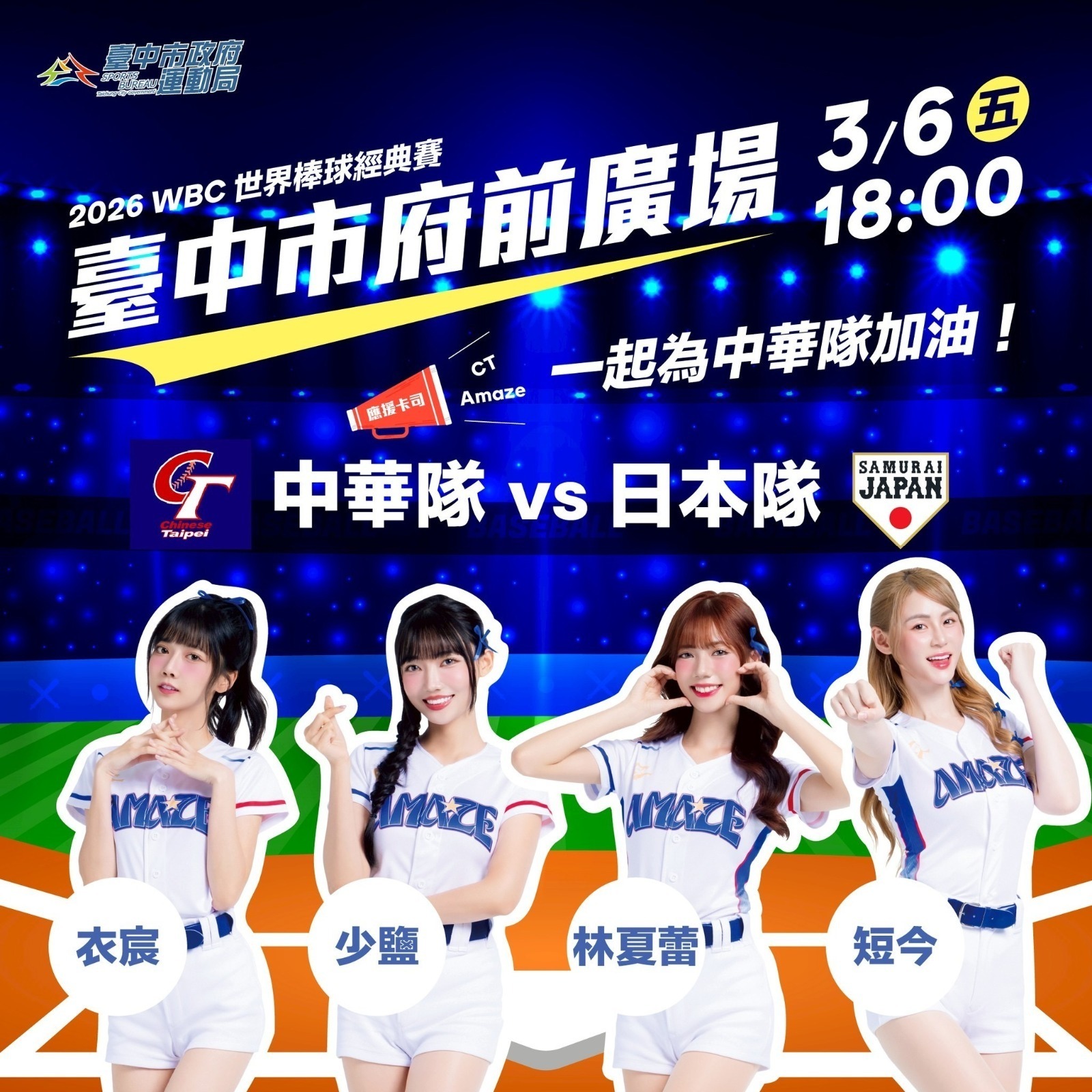為了營造最強的主場氣勢,市府這次祭出「視覺與聽覺」的雙重饗宴。府前廣場不僅出動1,300吋巨型螢幕全程轉播賽事,更重磅邀請職棒中信兄弟人氣團長「53哥」,率領短今、少鹽、林夏蕾、衣宸等CT AMAZE啦啦隊女神現身助陣。現場應援團將帶領球迷同步感受賽場律動,讓台中府前化身為熱血沸騰的第二賽場,沉浸式體驗世界級賽事的魅力。