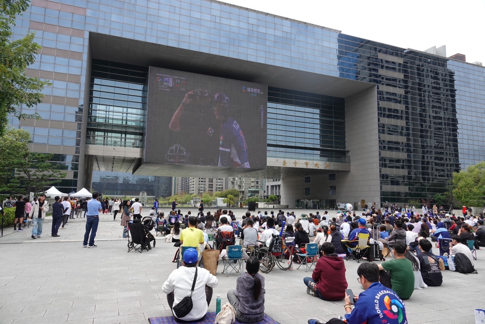 臺中市政府透過1300吋大螢幕轉播精彩賽事,府前廣場化身直播派對現場。圖/台中市政府