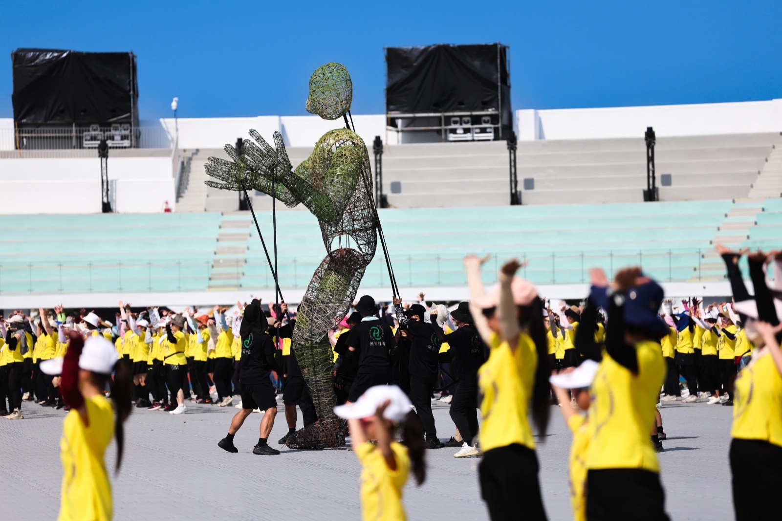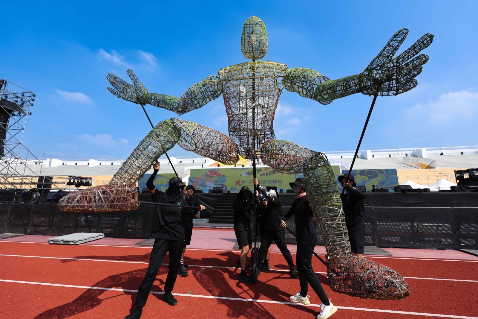 第114年全國運動會將於明(18)日在雲林縣虎尾鎮雲林縣立田徑場盛大開幕,各表演團隊今(17)日頂著烈日進行總彩排,為開幕式注入滿滿熱情。現場除了大型人偶與武術表演的精彩排演外,青春洋溢的熱舞團也全力練習,力求在明日呈現最完美的演出。 最引人注目的「大型人偶」演出,需要七名工作人員協同操作。每個人偶在烈陽下隨著音樂節奏舞動身軀,配合現場音效展現靈活動感。工作人員反覆練習步伐與姿勢,為了在正式開幕時帶來最佳視覺效果,儘管滿身大汗,仍不減熱情。