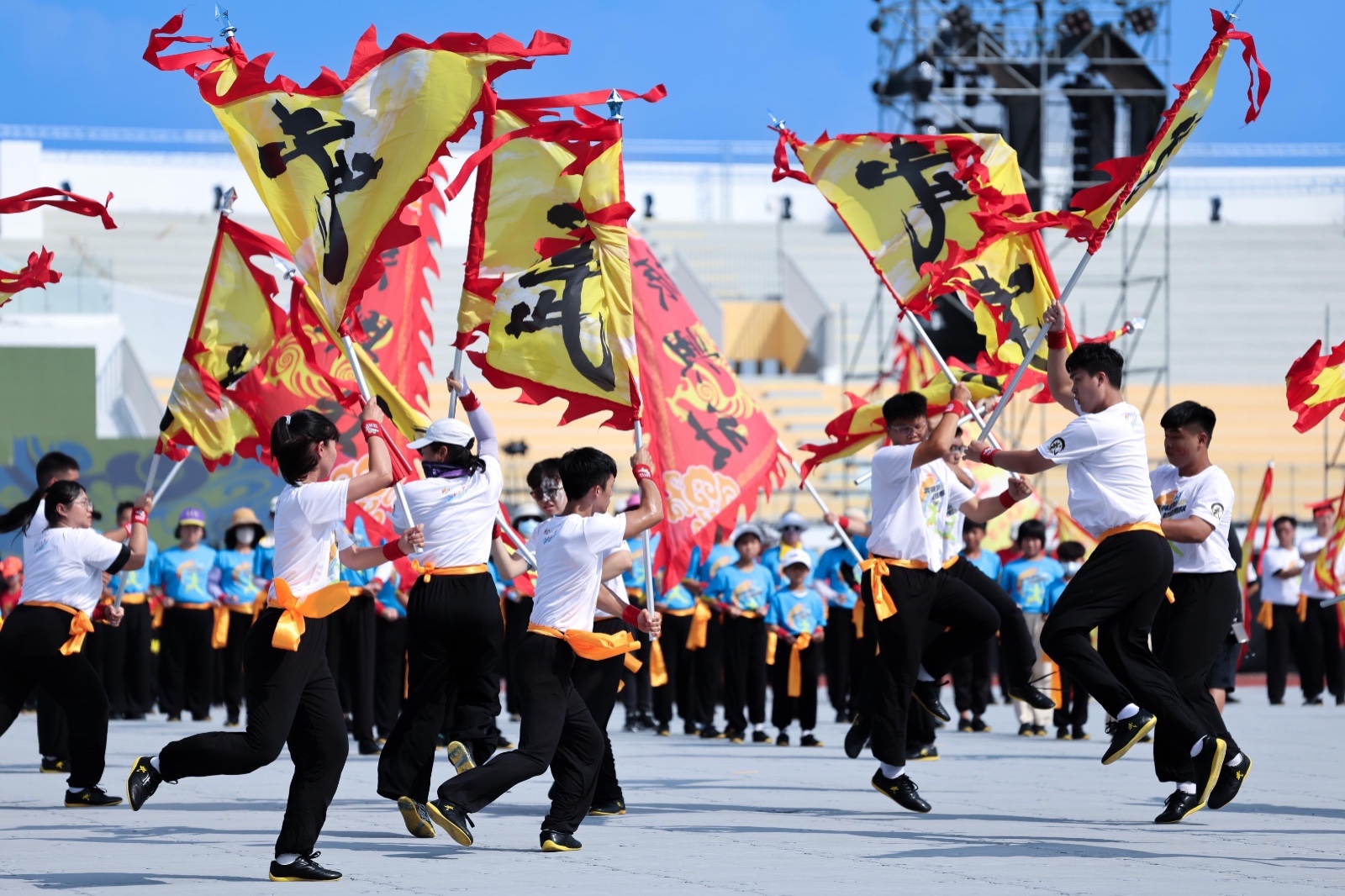 雲林的地方特色「武術表演」同樣是開幕式的重要亮點。多位身懷絕技的選手、舞動大旗,氣勢磅礡、場面壯觀,象徵雲林堅毅不拔的在地精神。團隊成員多為在地武術團體與學生,利用閒餘時間密集訓練,只為呈現最震撼的演出,讓觀眾一睹雲林的文化能量。 除了武術與大型人偶外,青春熱舞團的活力表演也為現場增添節奏感。年輕舞者結合音樂、燈光與創意編舞,象徵新世代運動精神與青春活力,讓開幕式兼具傳統與現代之美。