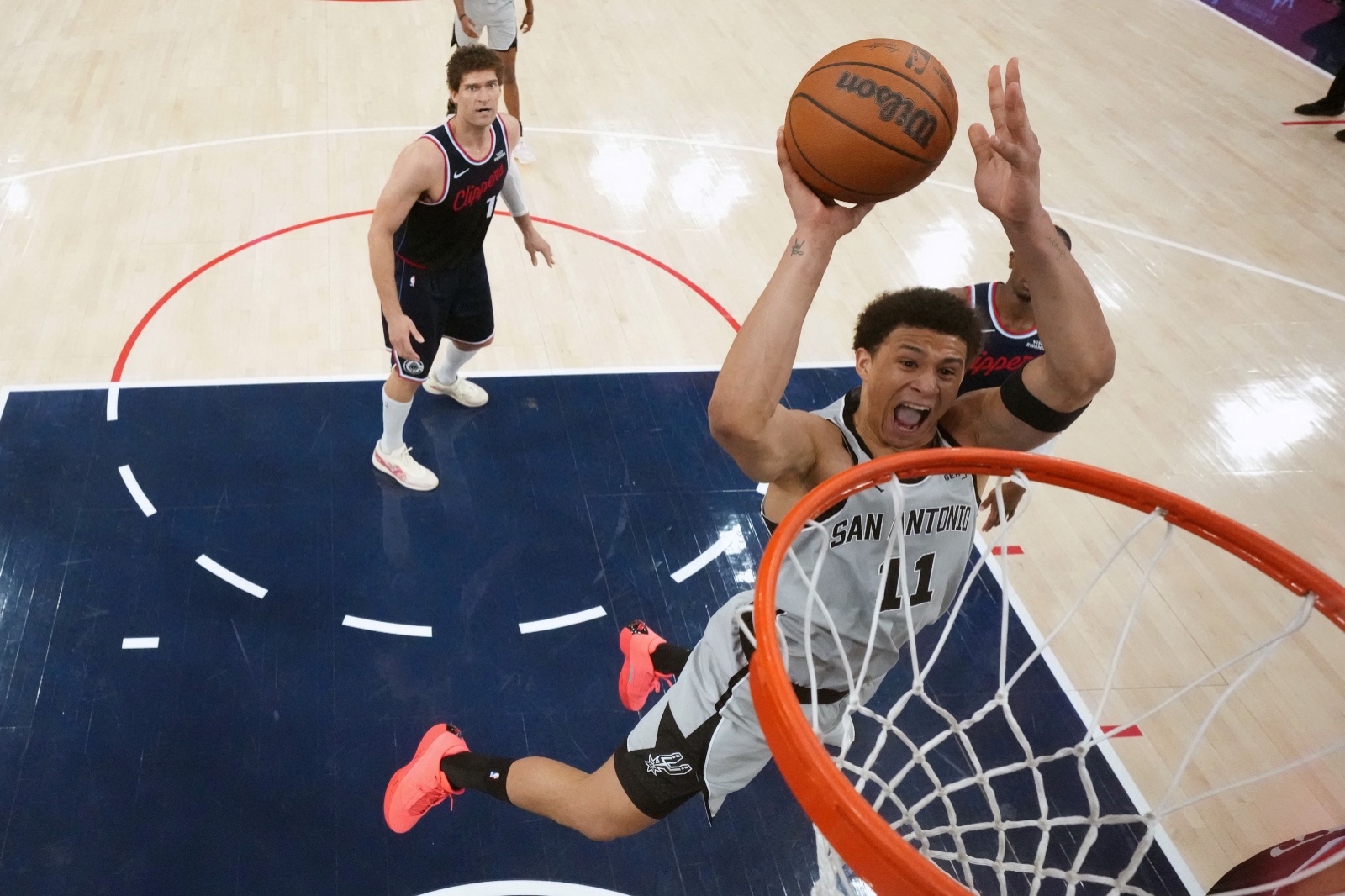 這名年僅 20 歲的前鋒,自從在 2025 年選秀會以首輪第 14 順位被馬刺隊選中後,便以其頂級的運動能力著稱。今日 NBA 官方推特(X)轉發了他在比賽中的高難度動作,並配文驚呼:「Carter Bryant 這種滯空時間到底是怎麼做到的?」影片中,Bryant 在切入後騰空而起,在空中停留的時間長到足以做出兩次動作修正,最後才輕巧地將球放進籃框,動作流暢且充滿美感。