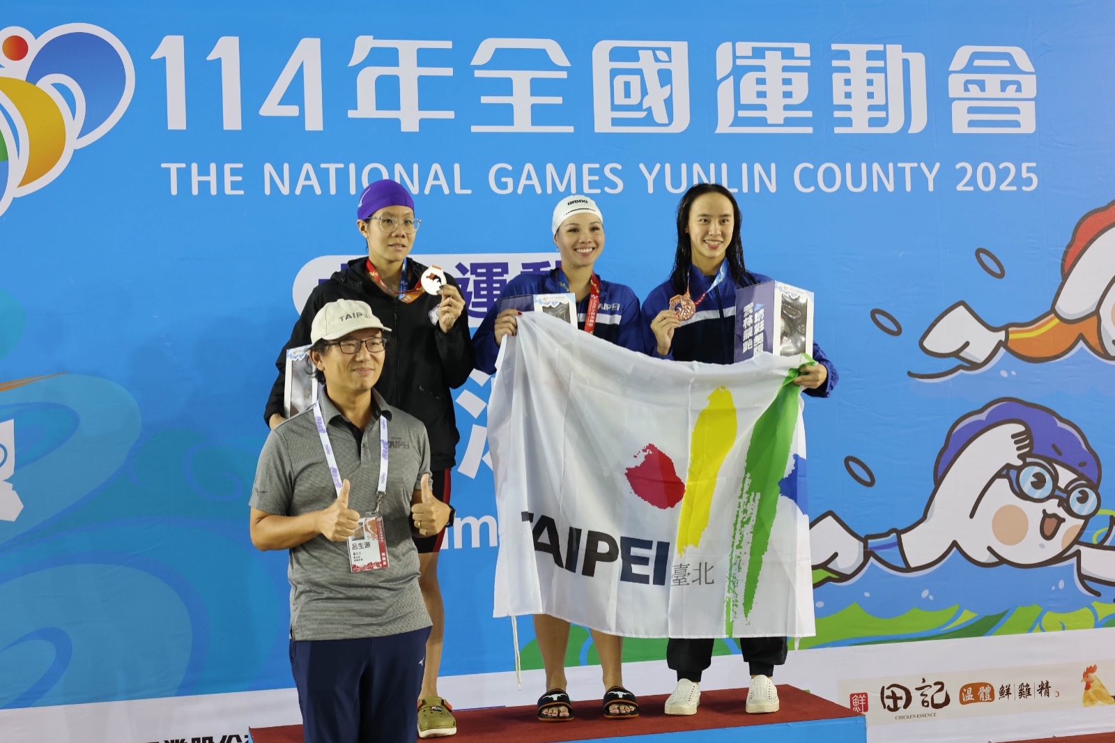 台美混血泳將韓安齊(中間領獎者)在114年全運會游泳項目畫下完美句點。記者翁清雅攝